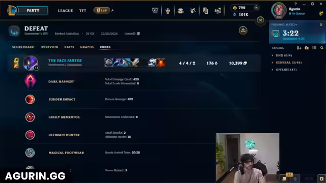 00:06:47Während des Streams werden mehrere League of Legends-Spiele gespielt und analysiert. Agurin zeigt Frustration über schwierige Spiele und unerwartete LP-Verluste. Er kritisiert Entscheidungen seiner Mitspieler, insbesondere im Jungle und Top Lane, und versucht, seine eigene Spielweise zu optimieren, z.B. durch den Einsatz von Jarvan. Er diskutiert Champion-Builds wie Spirit Visage für Jarvan und äußert Bedenken bezüglich eines möglichen Elise-Reworks, den er für unnötig hält. Das Gameplay ist geprägt von aggressiven Jungle-Routen,/objectiv-Fokus und Ranglistenspannungen.