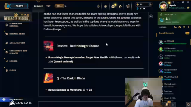00:02:40Zu Beginn des Streams begrüßt der Streamer seine Zuschauer und spricht über seine knappe Zeit von vier Stunden. Er erwähnt seine Hauptrolle im Jungle und diskutiert aktuelle Balance-Änderungen bei Champions wie Arthus, Gwen und Diana. Dabei analysiert er, warum Gwen als übermächtig galt, aufgrund ihres True Damage auf der Q-Fähigkeit, und stellt fest, dass sie ebenfalls einen Nerf erhalten hat. Auch Talia, Malphite und Nunu werden als starke Champions identifiziert.