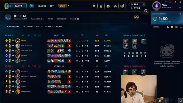 05:38:41Im weiteren Verlauf des Spiels wird das Spiel als verloren angesehen, da die Gegner die Top-Lane dominierten und das Team es nicht schaffte, die Übermacht der feindlichen Tanks zu kontern. Der Spieler gibt auf und startet ein letztes Spiel, das ebenfalls schwierig verläuft. Nach diesem finalen Match beendet der Streamer seinen Tag, da es Abend ist und er in ein neues Umziehen muss, mit der Ankündigung, am nächsten Tag zurückzukehren.