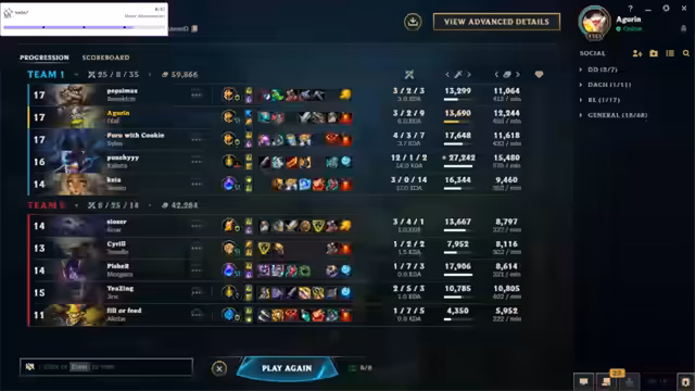07:59:12Der Streamer reflektiert über die gespielten Teamfights und erkennt, dass er, als Ryze, nicht ideal auf der Backline positioniert war, was zum Scheitern des ersten Engagements führte. Er identifiziert den Mangel an Vision als entscheidenden Faktor für seinen geringen Output in der Mid-Game-Phase. Im Nachgang zur Partie werden Picks und Builds kritisch beleuchtet, mit der Feststellung, dass zu viel magischer Schaden gewählt wurde und man für zukünftige Spiele auf mehr Tank-Champions im Top und Jungle setzen sollte, um Teamfights bestreiten zu können.