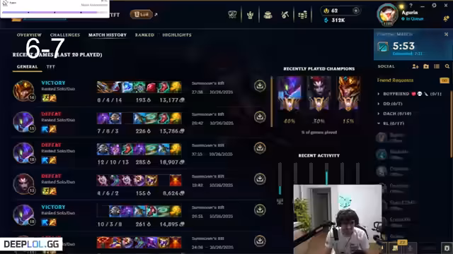 00:02:44Der Stream beginnt mit Begrüßungen und einem Hinweis auf die Zeitumstellung im EU-Raum. Der Streamer befindet sich auf Platz 12 und gibt sein Ziel bekannt, Rang 1 vor seinem Geburtstag zu erreichen. Er äußert Frustration über das Divisionssystem und erklärt, dass er sich nicht für Prime Division qualifizieren wird, um ein Jahr auf Division 1 zu warten, da er überzeugt ist, besser als viele LEC-Spieler zu sein. Gleichzeitig äußert er seine Bewunderung für den Pro-Gamer Argoin.