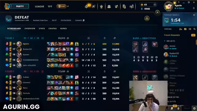 01:52:38Nach einer Reihe von unglücklich verlaufenen Teamkämpfen und einem verpassten Baron Nashor endet das Spiel in einer klaren Niederlage. Der Streamer ist sichtlich frustriert und beschreibt die Gegner als 'retarded'. Er beschließt, die Bot-Lane für den Rest des Streams zu meiden, da er der Meinung ist, dass seine Champions dort keine Chance haben. Er äußert, dass das Spiel für ihn nutzlos sei und zeigt allgemeine Unzufriedenheit mit dem aktuellen Matchmaking.