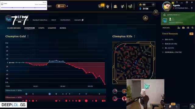 07:41:22Der Streamer kritisiert einen Spieler, der ihn angewiesen hatte, Bot zu gehen, obwohl er sich selbst als die Win Condition des Spiels sah. Er hält diesen Spieler für dumm und erkennt dessen Ingame-Namen, weiß aber nicht, wer er ist, obwohl er ein Challenger Peaker ist. Er überlegt, eine PowerPoint-Präsentation für die Champion-Auswahl zu erstellen, um seine Strategien besser zu vermitteln. Er äußert seine Frustration über die schlechte Leistung seines Junglers, der in den letzten drei Spielen und auch im aktuellen Spiel schlecht spielte. Er hofft, dass die Bot- oder Mid-Lane gewinnt, da der Jungler eine 50% Winrate in 17 Spielen mit Zoe hat, was er als schrecklich empfindet. Er ist schockiert über die Leistung seines Junglers, der nur ein Camp gemacht hat und fragt sich, was im Jungle passiert ist. Der Jungler hat Raptors in das gegnerische Blue gemacht, was zu langsam war und er hat Gromp nicht bekommen. Er stellt fest, dass der Jungler nur 4 CS hatte und immer noch Flash besitzt. Er ist der Meinung, dass er komplett verloren ist, wenn der Gegner Level 6 erreicht.