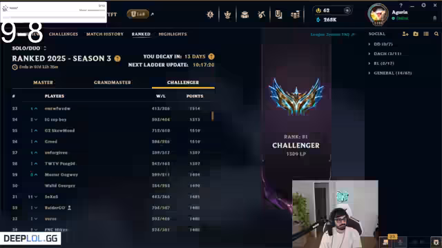 Es wurde ein bemerkenswerter Aufstieg im Ranglistenmodus verzeichnet, bei dem von Platz 101 mit 1254LP gestartet wurde. Spieler zeigt überdurchschnittliche Leistungen, dennoch wurden durch Fehlentscheidungen im Team Spiele verloren. Als Konsequenz wurde eine detaillierte Coaching-Einheit angekündigt, um taktische Lektionen zur Jungle-Effizienz zu vermitteln.