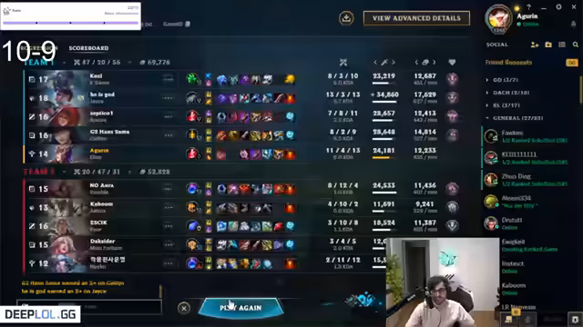 10:01:24Agurin berechnet seinen aktuellen LP-Gewinn und stellt fest, dass ein weiterer Sieg ihn trotz positiver Spielbilanz immer noch in einem negativen Tagesnetto belassen würde. Er drückt Frustration über den hohen LP-Verlust in früheren Spielen aus und vergleicht die aktuelle Situation mit einem Marathon, bei dem er trotz einiger Siege immer noch im Minus ist. Die Diskussion zeigt seine anhaltenden Bemühungen, das Ranking zu verbessern, aber auch die Herausforderungen durch ungleiche LP-Gewinne und Verluste.