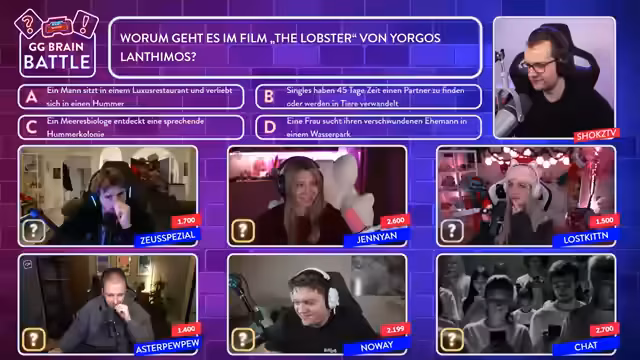 00:10:36Zum Start des Dezembers findet ein weiteres GG Brain Battle auf dem Kanal statt, bei dem die Teilnehmer NoWay4u, LostKitten, Zeus, Jen und Asterpewpew gegeneinander antreten. Es ist bereits das dritte Quiz-Event in diesem Jahr, wobei die Organisatoren betonen, dass die Fragen im Vergleich zu den vorherigen Runden deutlich anspruchsvoller geworden sind. Die Atmosphäre ist locker und humorvoll, da die Teilnehmer sich gegenseitig auf die Schippe nehmen und ihre eigene 'Intelligenz' im Vergleich zu den anderen kommentieren, bevor das eigentliche Thema Serien, Filme und Gaming sowie Anime offiziell verkündet wird.