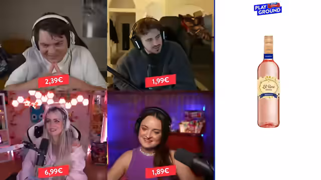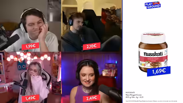 01:11:19Das erste Produkt für „Guess the Price“ ist ein 500g Glas Bio-Honig. Die Schätzungen der Teilnehmer variieren, wobei No Way und Lost Kitten mit 3,99 Euro am nächsten am tatsächlichen Preis von 3,75 Euro liegen und dafür Punkte erhalten. Zeus gibt an, noch nie Honig gegessen zu haben. Als nächstes wird der Preis einer 0,75 Liter Flasche Lil Rosé Wildberry Alkoholfrei gesucht. Zeus trifft mit 1,99 Euro genau den Preis und erhält dafür extra viele Punkte. Das dritte Produkt ist Micellenwasser von La Cura. Die Teilnehmer diskutieren über den Preis von Abschminkprodukten und die Inhaltsstoffe wie Macadamia-Nussöl. Nika liegt mit 1,49 Euro am nächsten am tatsächlichen Preis von 1,45 Euro und gewinnt diese Runde. Die Spieler reflektieren über ihre Pflegeroutinen und die Herausforderungen, die genauen Preise zu erraten, da diese nicht immer auf 99 Cent enden.