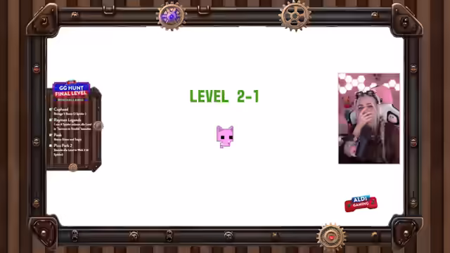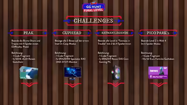 Im finalen Level der GG Hunt von Aldi Gaming treten sechs Teilnehmer in verschiedenen Spielen an, um Codefragmente zu sammeln. Peak, Cuphead, Rayman Legends und Pico Park 2 stehen auf dem Programm. Nach jeder Challenge gibt es Giveaways für die Zuschauer. Am Ende winkt das 'Good Game für alle' und eine Fortnite Map.