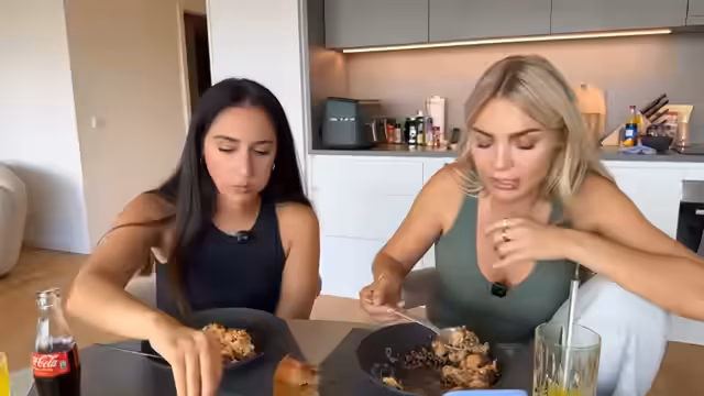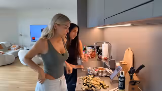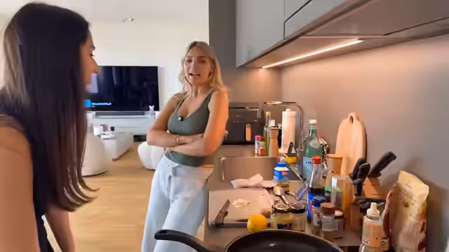 01:48:28Während des Kochens wird über das Aussehen der Auberginen und die Konsistenz der Tahina-Paste gesprochen. Es wird festgestellt, dass das Gericht noch abgeschmeckt werden muss und Alexisshv ist aktiv am Kochprozess beteiligt. Es wird ein Kaffee angeboten, aber aufgrund der Zubereitung abgelehnt. Eine Armdrück-Challenge wird abgelehnt, da sie sich als "Prinzessinnen" sehen. Es wird über den Wunsch diskutiert, erst das Essen zu probieren, bevor mit dem Kochen fortgefahren wird, aber letztendlich wird entschieden, beides parallel zu machen. Die Abwesenheit des Partners von Mascha wird thematisiert. Es wird über die Verwendung von Granatapfelsirup und Tahina-Paste für einen Dip gesprochen, wobei das Aussehen zunächst kritisiert, aber der Geschmack gelobt wird. Die Teletuby-Stühle werden erwähnt und es wird über das regnerische Wetter in Hamburg gesprochen. Eine Anekdote über eine Tee-Bestellung in einer Bar wird erzählt. Die Qualität der Karotten wird in Frage gestellt und entschieden, eine zu weiche Karotte nicht zu verwenden. Es wird kurz über Social Media gesprochen und ob es ein Muss ist.