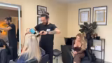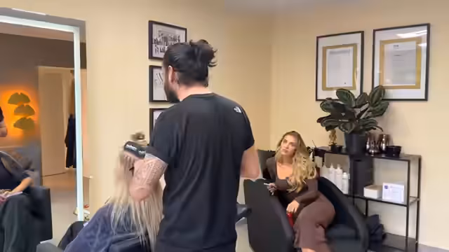 02:02:56Alexas Haare erhalten viel Lob im Chat, mit Bewertungen zwischen 10 und 100 von 10. Der Friseur macht einen großartigen Job und Alexa sieht wieder wie eine Prinzessin aus. Es werden verschiedene Haarpflegeprodukte wie Kerastase-Shampoo und Hitzeschutz erwähnt. Alexa möchte ihre Haare etwas dunkler färfen, da ihr jetziges Blond zu 'gelb' erscheint. Der Friseur erklärt, dass sie den Haaransatz dunkler färft und das Ergebnis in etwa 80 % Naturfarbe sei.