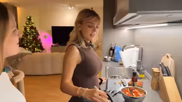 01:02:56Während des Kochens stellt Alexis fest, dass ihr für die Nudeln der benötigte Topf fehlt. Gemeinsam gehen sie durch die Küche und Alexis entdeckt überraschend einen viel größeren Topf, von dem sie bisher nichts wusste. Diese Entdeckung führt zu einer intensiven Diskussion über ihre Kochgewohnheiten und die Organisation in ihrer Küche. Lucia, die aus der Hotellerie kommt, teilt Alexis mit, dass die Nudeln in ausreichend Wasser gekocht werden müssen und bestätigt die Wahl der Zutaten für die Bolognese-Sauce.