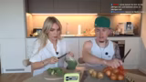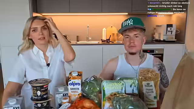 00:17:30Nachdem die technischen und persönlichen Themen geklärt sind, beginnen die Streamer mit der Vorbereitung des Essens. Sie präsentieren ihre Einkäufe, die vegane Fleischersatz-Filetstreifen, verschiedene Pflanzenmilchsorten, Dinkelnudeln, Brokkoli, Kürbis und Zwiebeln. Sie setzen sich an die Kochinsel, um mit dem Schneiden der Zwiebeln und der Vorbereitung der Brokkoliröschen zu beginnen. Der Streamer zeigt sich überfordert von der Aufgabe, während Alexis als geübte Kocherin agiert.