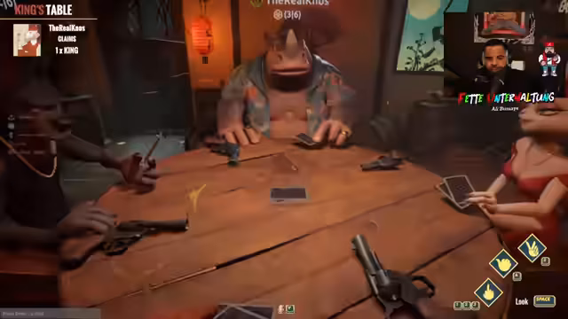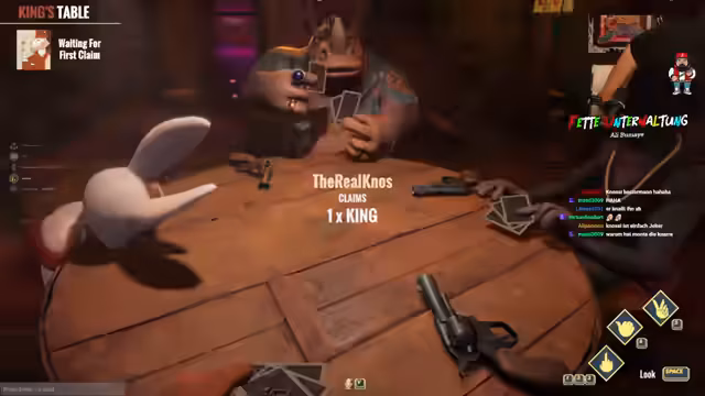04:02:47Endlich ist es gelungen, alle Spieler in die Lobby zu bringen. Die Regeln des Spiels King's Table werden nun erklärt. Das Ziel ist, als Erster alle Karten loszuwerden. Spieler können Karten ablegen und lügen, wobei andere Spieler dies mit einem Schuss kontern können. Das Spiel verläuft wie eine Mischung aus Lügenrunden und Russischem Roulette, bei dem ein Treffer zum Ausscheiden führt. Nach einer kurzen Erklärungsphase beginnt das Spiel mit einer Testrunde.