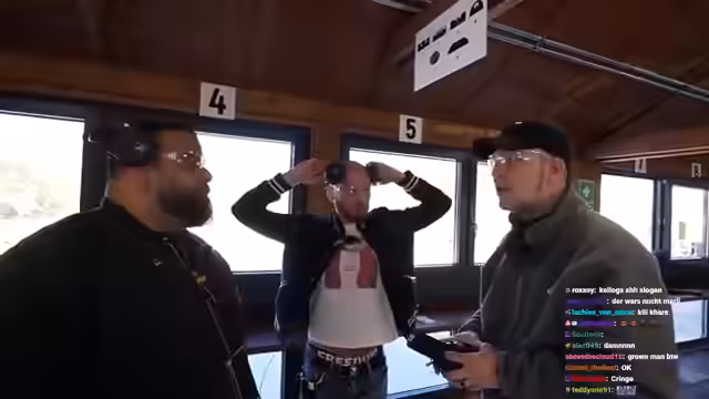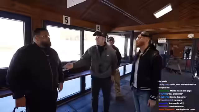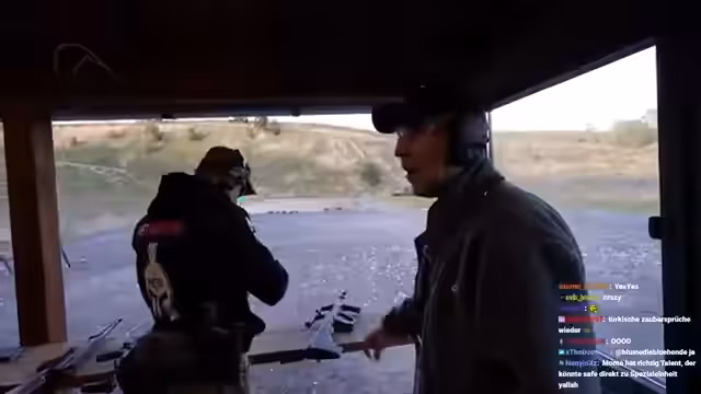 01:23:31Monte erklärt technische Details zum Umgang mit den Waffen, während sie verschiedene Übungen durchführen. Sie schießen auf Ziele in verschiedenen Entfernungen, wobei Ali besonders auffällig gute Treffer erzielt. Immer wieder unterbrechen technische Probleme den Ablauf, wie zum Beispiel die Frage, wer die Kamera bedient. Die Streamer berichten auch von einer begeisterten Gruppe von Besuchern, die eine private Atmosphäre stören.