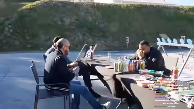 01:45:35Nach den Schießübungen geht es zum Grillen, aber der Grill bereitet Schwierigkeiten und erhitzt sich nicht ordnungsgemäß. Die Streamer vermuten Wind als Ursache und überlegen, die Position des Grills zu ändern. Parallel dazu diskutieren sie über ihre Pläne, insbesondere einen möglichen Deutschland-Rad-Irl-Stream, den sie als zu schwierig ansehen. Auch persönliche Themen, wie Montes Verhältnis zu seinem Vater, der im Gefängnis ist, werden angesprochen.