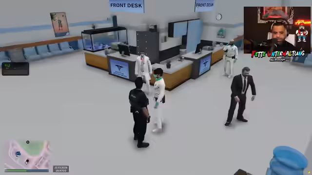02:26:46Eine Person namens Herr Baddilov wird aufgrund von Geschwindigkeitsüberschreitung und gefährlichem Eingriff festgenommen. Dabei wird ihm eine Geldstrafe von 4110 Dollar sowie eine Haftandrohung von 40 Einheiten auferlegt. Anschließend wird er wegen massiver Kopfschmerzen und Unzufriedenheit mit einer rezeptiven Behandlung im MD stationär aufgenommen und muss sich einem umfassenden, zweistündigen Gesundheitscheck unterziehen.