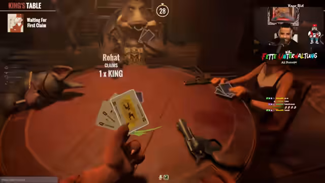 03:04:35Nach einer Reihe von missglückten Runden mit wenig kooperativen Mitspielern, die ihn im Stich lassen und ihm keinen 'Shield Recharger' geben, steigt der Streamer frustriert aus dem Arc Raiders-Modus aus. Er beschwert sich über das Spielverhalten und wechselt zu dem Kartenspiel 'Queen's Table'. Er erklärt den Spielmechanismus und startet eine Testrunde, um das Spiel zu demonstrieren, was den Übergang zum nächsten Hauptspielinhalt markiert.