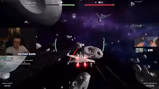 03:32:17Nachdem die Gruppe erfolgreich die Verteidigungssysteme ausgeschaltet hat, beginnt der finale Angriff auf den Todesstern. Es kommt zu intensiven Kämpfen und der Streamer muss mehrmals gerettet werden. Der Höhepunkt ist die Zerstörung des Todessterns, die als extrem aufregend und erfolgreich beschrieben wird. Die Zusammenarbeit mit anderen Teammitgliedern wie Hope wird besonders hervorgehoben, die besonders schnell und effektiv in der Mission war.