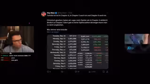 00:10:05Der Streamer präsentiert und erläutert die aktuellsten, niedrigsten Spielerzahlen in der Geschichte von Fortnite. Er zeigt Screenshots von Tweets, die nur 197.000 Spieler in den Epic Games Game-Modi und 367.000 Spieler auf der gesamten Plattform belegen. Er führt diesen drastischen Rückauf auf die Rückkehr zur Schule in Deutschland und auf eine generell sinkende Tendenz im Freizeitverhalten nach den Sommerferien zurück, was als logisch aber dennoch bemerkenswert angesehen wird.