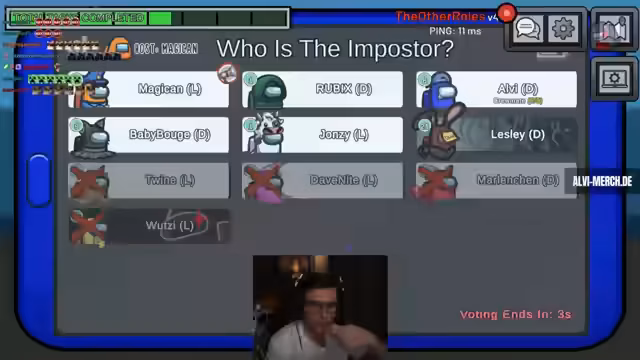 03:06:44Die Spannung steigt, als der Streamer als Ingenieur Magicant in einen Vent trap lockt und dessen Bewegungen mit einem Tracker überwacht. Als Magicant aus dem Vent kommt und direkt zum Tatort geht, gilt er als überführter Imposter. Wutzi wird ebenfalls verdächtigt, aber der Streamer erklärt, dass Wutzi ein cleveres Bluffing gespielt habe. Das Spiel endet nach dieser intensiven Runde mit dem Vot gegen Magicant.