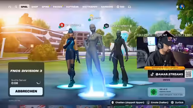 00:00:00Zu Beginn des Streams sucht der Streamer aktiv ein bestimmtes Skin, findet es jedoch nicht sofort. Nach der erfolgreichen Einladung seiner Mitspieler Aroya und Mystic beginnt er mit dem Intro für den Trio Cup. Der Streamer qualifiziert sich für das FNCS-Turnier in Division 3 und hat das ambitionierte Ziel, in Division 2 aufzusteigen. Er erwähnt, dass sein Freund Max es ebenfalls nicht geschafft hat und betont, dass sie nur 250 Punkte für die Qualifikation benötigen.