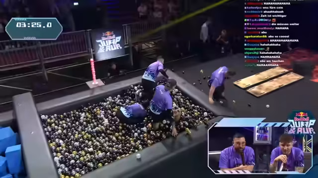 01:31:49Team No Way bereitet sich auf ihren Lauf vor, wobei sie den Vorteil haben, die vorherigen Durchgänge beobachtet und eine Taktik entwickelt zu haben. Es wird erwähnt, dass sie bereits vor ein bis zwei Wochen einen Probelauf in einer Freerunning-Arena absolviert haben. Die Diskussion dreht sich darum, ob sie an einem Reaktionsspiel vorbeilaufen dürfen. Während des Laufs zeigt sich eine ausgearbeitete Taktik mit Räuberleiter, wobei Toni als letztes hochgehoben wird. Karbonett rollt elegant über ein Hindernis, und Novi scheint unaufhaltsam. Es gibt Schwierigkeiten bei der Suche nach einer Kugel, und es wird vermutet, dass diese ganz unten sein muss. An den Bälle-Kanonen stehen Nova, Julie Poole, Paula und Maxify bereit, um die Teilnehmer abzuballern. Der Capitano packt die Bälle ein, und das Team gewinnt an Selbstvertrauen. Ein Teilnehmer zeigt übermäßigen Ehrgeiz bei der Suche nach einem Ball im Bällebad. Es wird spekuliert, dass jemand im Bällebad übernachten könnte. Die Platzierung des Brettes erweist sich als schwierig, aber die Red Bull Jump and Run-Socken werden gelobt. Eine Red Bull Athletin hat zuvor mit einer schnellen Zeit beeindruckt und falsche Standards gesetzt. Die Level wurden bewusst geheim gehalten, um die Creator nicht zu früh darauf einzustellen. Das Konzept wird als Videospiel im echten Leben und Kindheitstraum beschrieben. Team No Way muss den Walk of Shame unter einem Hindernis durchkrabbeln. Julie hat die beste Position beim Abballern und Leon wird unterstützt. Es wird der Wunsch geäußert, selbst an so einem Jump'n'Run teilzunehmen.