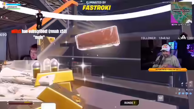 00:00:00Der Stream beginnt mit der Landung in einem bergigen Gebiet, wo zunächst die Umgebung nach Loot abgesucht wird. Es werden Waffen wie ARs, Revolver-Shotguns und blaue Pumpguns gefunden. Die ersten Interaktionen mit dem Chat finden statt, wobei Grüße ausgetauscht und die Stimmung als positiv hervorgehoben wird. Es wird über die Notwendigkeit von Minis und Heilgegenständen gesprochen, wobei der Fokus auf der Optimierung des Inventars liegt. Strategische Überlegungen bezüglich des Standorts und der Ressourcensammlung werden angestellt, einschließlich des Besuchs eines Shops für Gold und der Diskussion über die besten Routen, um Metall zu farmen. Die Spieler einigen sich darauf, eine erhöhte Position einzunehmen, um sich einen Vorteil gegenüber anderen Teams zu verschaffen, und tauschen sich über die Positionen und Bewegungen der Gegner aus. Dabei werden Taktiken wie das Ausnutzen von Jump Pads und das Rampenbauen eingesetzt, um sich fortzubewegen und Gegner auszumanövrieren. Es werden erste Schusswechsel ausgetragen, wobei versucht wird, Gegner zu überraschen und auszuschalten, während gleichzeitig auf die eigene Deckung geachtet wird. Die Bedeutung von Kommunikation und Teamwork wird betont, um in den Kämpfen erfolgreich zu sein.