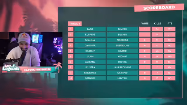 04:48:39Nach Beendigung des Turniers werden die finalen Platzierungen vorgestellt. Gewinner des Lost Legends Creator Cups ist das Team 'Nikolos Specialist'. Der Streamer und sein Team landeten auf dem achten Platz und konnten sich so Earnings sichern. Die Preisgeldverteilung wird erläutert: Top 10 Teams erhalten Preisgelder, wobei der erste Platz 5.000 Euro und der zehnte Platz noch 1.000 Euro erhält. Zusätzlich wurde eine 'Special-Runde' ausgetragen, die von Edima und Fabo gewonnen wurde, die ebenfalls 2.000 Preisgeld mitnahmen.