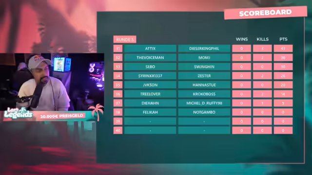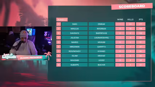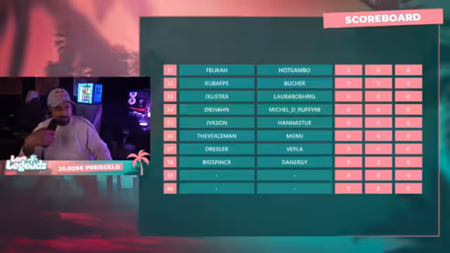 04:45:42Nach über vier Stunden Fortnite Battle Royale endet der 'Lost Legends Creator Cup'. Amar kündigt die Veröffentlichung der finalen Standings an und zeigt das Gesamtpreisgeld von 20.000€. Besonders hervorhebt er die Special-Runde mit 2000€ Preisgeld, die von Edima und Fabo gewonnen wurde. Die Gewinner der Top-Platzierungen erhalten Earnings, während Teilnehmer ab Platz 40 Ehrenurkunden bekommen.