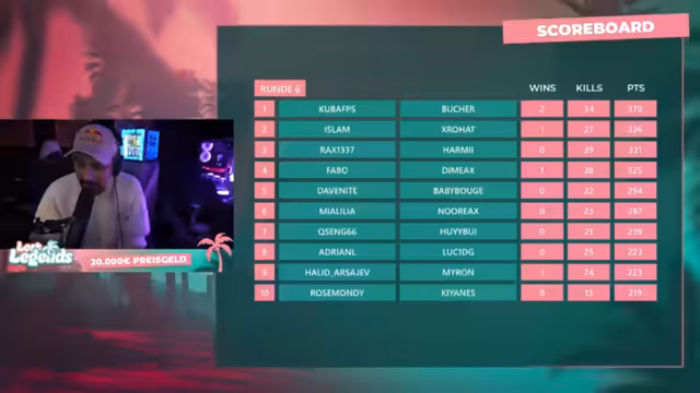 01:29:39Der Streamer stellt die Standings des Turniers vor, wobei Fabo mit 116 Punkten und 24 Kills führt. Er erklärt die Preisgeldverteilung ab Platz 10 und listet die Top-10-Teams auf, darunter Mia, DaveKnight und Sammy. Die Rangliste zeigt die Vielfalt der Teilnehmer aus verschiedenen Sparten wie Valorant und Fortnite, mit besonderem Fokus auf die Überraschungsmannschaften.