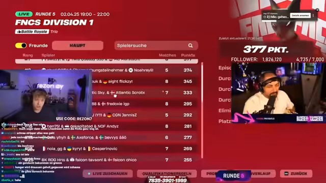 05:55:33Es wird auf die Verwendung des Creator Codes 'Amar' im Fortnite-Shop hingewiesen und um Unterstützung gebeten, selbst wenn keine Käufe getätigt werden. Ein kurzer Überblick über die Ergebnisse in Division 1 wird gegeben, wobei Veno, Flichi und Vico sowie Noah und Shark hervorgehoben werden. Auch Thomas HD, Pardosai, Cringe, Creasy, Kami und iDrop werden erwähnt. Kylie wird für ihre jüngsten Erfolge gelobt. Anschließend wird auf die Ergebnisse in Division 2 eingegangen, wobei Reason, Mr. Savage und Vardial unter den Top 2 genannt werden. Der Chat vermutet, dass der Drittplatzierte cheatet. Es folgt eine Diskussion über Margaritas und Pizza, sowie die Frage, ob André noch im Haus ist.