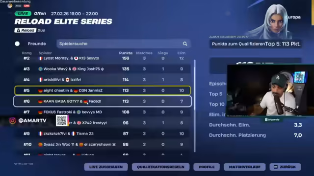05:15:13Während des Streams werden die laufenden FNCS-Heats intensiv verfolgt und analysiert. Der Streamer äußert klare Vorhersagen und Favoriten, unter anderem die Teams Shark und Teenie, sowie Chap und Flichi. Er diskutiert die Erfolgschancen der Teams und äußert sich begeistert über deren Leistungen, wie zum Beispiel einen 20-Kill-Sieg. Die Spannung steigt, da die Punkteverteilung knapp ist und ein Sieg mit 60 Punkten entscheidend für die Qualifikation ist.