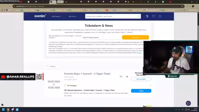 03:48:09Der Stream konzentriert sich auf den bevorstehenden Ticketverkauf für das Fortnite Major 1 Summit in der PSD Dome Arena Düsseldorf. Die Tickets werden voraussichtlich am Montag um 10 Uhr auf Eventim für verschiedene Preisklassen freigeschaltet, wobei ein VIP-Paket mit Meet & Greet für 400 Euro angeboten wird. Die Preise der regulären Tickets variieren zwischen 159 und 250 Euro. Der Streamer plant, mit seinem Chat eine deutsche Fangemeinschaft in einem bestimmten Block der Arena zu organisieren, um eine lautstarke Unterstützung und einen eigenen 'Ultra-Block' zu schaffen.