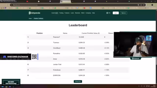 01:58:41Der Streamer kündigt eine Kooperation mit Bitpanda an, bei der das Ziel ist, ein Portfolio langfristig aufzubauen. Zusammen mit Leon, einem Daytrader und Bruder von 'Reason', wird das Portfolio vorgestellt. Zunächst wird erklärt, was Bitpanda ist und dass es sich um eine Plattform für Kryptowährungen, Aktien, ETFs und Edelmetalle handelt. Der Streamer betont ausdrücklich, dass dies keine Finanzberatung sei. Das aktuelle Portfolio, das mit 10.000 Euro von Bitpanda gestartet wurde, wird gezeigt und es wird eine Herausforderung für die Community verkündet.