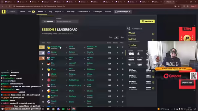 00:28:05Es findet eine Debatte über zukünftige Fortnite-Formate statt. Der Streamer äußert die Ansicht, dass Epic Games nicht so weit planen, wie angenommen, und warnt vor der Einführung von Solo-FNCS. Die Teilnehmer des FNCS Finals werden nach ihren Plätzen und Erfolgen benannt. Während einige Top-Teams wie Vaniak-Pixie-Marius dominieren, kämpfen andere bekannte Namen wie Reason und Mongral mit Placements und werden früh eliminiert.