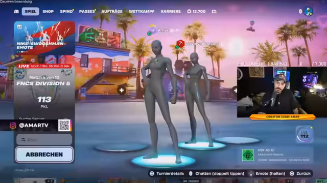 05:52:14Der Streamer startet den FNCS Cup in der amerikanischen Region, um in Division 1 aufzusteigen. Er spielt mit Vardial und strategisiert über Landeplätze und den Umgang mit Gegnern in der ersten Runde auf Lethal Labs. Der Fokus liegt auf dem Farmen von Ressourcen und dem Halten der Ränder, während er die Gegner als schlecht bewertet.
