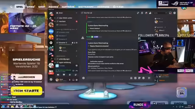 00:18:47Der Streamer erklärt die Regeln und den genauen Ablauf seines 10.000€ Fortnite-Turniers 'Rasieren & Kassieren'. Das Turnier wird mit Sponsoren wie Nvidia, Asus und Epic Games ausgetragen und hat ein Gesamtvolumen von über 100.000 Euro. Für die Qualifikation müssen die Teilnehmer im Discord den UniteBot hinzufügen und sich verifizieren. Jede Qualifikationsrunde findet im 'Reload'-Modus mit 40 Spielern statt. Der Sieger pro Runde ist nicht der Gewinner der Lobby, sondern der Spieler mit den meisten Kills. Die Qualifikation erfolgt im Solo-Modus, und es gibt aktuell noch keine Begleit-Tickets für Begleitpersonen.