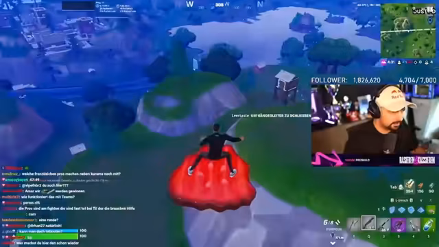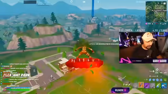 00:59:50Nachdem die fehlerhafte Teamzuteilung bemerkt wird, restartet das Spiel. Der Streamer landet und findet sofort exzellente Beute, darunter einen epischen Raketenwerfer und einen Bogen, mit dem er mehrere Gegner eliminiert. Trotz der besseren Ausrüstung bemerkt er, dass die französischen Gegner sehr defensiv spielen und sich häufig verstecken. Es folgen mehrere kleinere Scharmuzeln, bei denen der Streamer Schaden anrichtet, aber nicht direkt einen Kill landet.