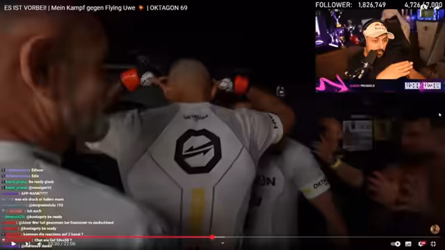 03:14:31Nach 2 Minuten und 51 Sekunden gewinnt Edis den Kampf gegen Flying Uwe durch TKO Ground and Pound. Die Stimmung eskaliert, als Edis' Team ihn feierlich auf die Schultern nimmt. Der Streamer, der emotional stark involviert ist, gibt an, im Chaos selbst körperliche Angriffe von Security zu erleiden. Der Sieg löst bei allen, insbesondere beim Vater von Edis, eine immense emotionale Welle aus.
