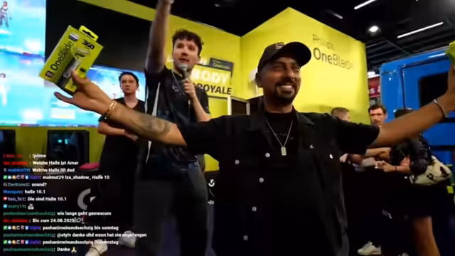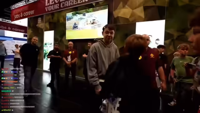 02:01:27Der Streamer und sein Team machen sich auf, um mehr von der Gamescom zu erkunden und weitere Hallen zu besuchen. Sicherheitspersonal fordert sie jedoch auf, sich nicht aufzuhalten oder Fotos zu machen, was den Stream verärgert. Sie treffen auf Follower, wie den Streamer Alex, und halten eine spontane Autogramm-Session ab. Der Inhalt des Chats ist eher tot, was der Streamer kommentiert und über die vergangene, erfolgreiche Event-Nacht mit vielen Zuschauern spricht.