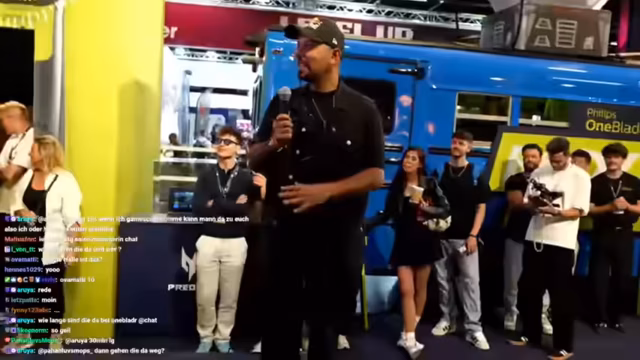 01:25:49Als der Streamer durch die Menge geht, trifft er auf Fans, die speziell für die Gamescom angereist sind. Er nutzt die Gelegenheit, um Fotos zu machen und sich kurz mit ihnen zu unterhalten. Dabei erwähnt er, dass er auf dem Weg zu einem Stand ist, bei dem er Hilfe von einem Teammitglied namens Arcon sucht, das nach einem vorherigen Camping-Abenteuer mit einem Fahrzeug für den Transport bereitsteht.