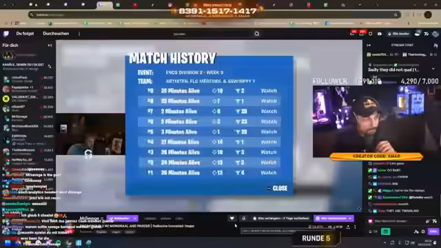 03:17:33Es wird eine Liste von prominenten Teams genannt, die nicht am Finale teilnehmen, darunter Mungral, Savage, Panzer, Focus und ADN. Besonders der Verzicht von Savage sorgt für Unmut. Das Team auf dem achten Platz steht im Verdacht, nicht fair zu spielen. Der Streamer und das Publikum vermuten, dass der Spieler einen Zweit-Account nutzt, um Turniere zu bestreiten, da der Haupt-Account gesperrt sein könnte. Er vermutet, dass Epic Games es erlauben könnte, auf solchen Zweit-Accounts zu queue.