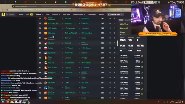 03:11:01Der Streamer gibt einen Überblick über die aktuellen Standings des FNCS-Trio Cups. Er analysiert die Punktestände der führenden Teams und äußert sich über deren Leistung. Zum Zeitpunkt der Aufzeichnung führt das Team 'Hyper' mit 14, 24, 15 Kills und einer Punktzahl, die deutlich über der von anderen Top-Teams liegt. Auch Teams wie 'Cringe' und 'Vyko' werden genannt und ihre Positionen in der Gesamtwertung diskutiert. Es wird deutlich, dass das Rennen um die Finalteilnahme noch offen ist und der zweite Turniertag entscheidend sein wird.
