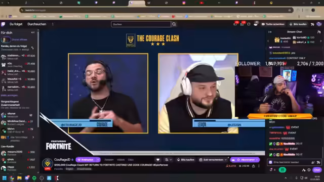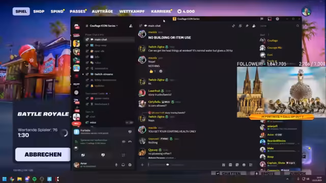 00:38:11Courage JD stellt im Stream die Turnierstruktur vor: Fünf Spiele mit einzigartigen Regeln, insgesamt 100.000$ Preispool (80.000$ Hauptpreis, 10.000$ für Hide & Seek, 5.000$ pro Delulu-Lobby). Er bestätigt, dass Game 1 ein Zero-Build-Modus mit Selbst-Revive und Reboot-Vans ist. Die Teilnehmerliste umfasst Top-Pros wie Klix, Burnt Peanut, FNCS-Champions und Aid. Courage JD betont, dass das Event im Vergleich zu anderen Fortnite-Turniers besondere Herausforderungen birgt, da 80 Spieler in fünf verschiedenen Modi koordiniert werden müssen.