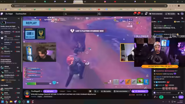 02:40:38Ein spielverändernder Moment: Das Team wird während eines intensiven Endgames per Rift außerhalb der Zone teleportiert. Trotz der chaotischen Situation ("Es geht um 10.000 Euro und ich werde out of zone geriftet") entscheidet sich die Lobby für einen gemeinsamen Sieg ("Split the money"). Dies führt zu Verwirrung ("Epic, what is going on?"), da alle 16 verbliebenen Spieler den Gewinn teilen. Der Streamer und sein Partner erhalten ca. 1.600$ each – ein unerwartetes, aber positives Ergebnis trotz technischer Probleme und unklarer Spielsituation.