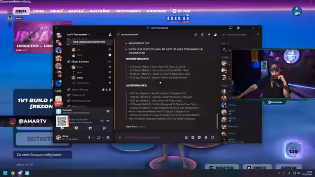 00:06:16Amar startet den Stream und kündigt sein erstes großes Turnier im Wert von 250.000 Dollar an. Es wird eine internationale Veranstaltung, und Amar plant für heute eine Viewing-Party mit Videl Daniel. Der Fokus liegt auf dem FNCS Div. 1 Finale, an dem viele bekannte Teams wie Mr. Savage und Reason teilnehmen. Der Streamer präsentiert den Creator-Code und bittet die Zuschauer, diesen zu nutzen.