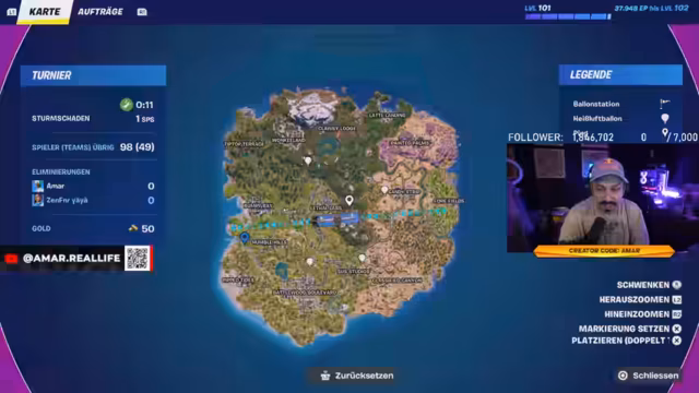 00:00:00Der Streamer startet Fortnite und befindet sich in Division 5, obwohl er die Schwierigkeit dieser Liga für unpassend hält. Er erklärt, dass er nur dem Wunsch eines Community-Mitglieds folgt, das für diese Division niemanden gefunden hat. Das Gameplay konzentriert sich auf das Erzielen von Platzierungspunkten, da Kills keinen Einfluss auf das Ranking haben. Es wird über Landestrategien diskutiert und die Suche nach geeigneten Mitspielern gestaltet sich schwierig.