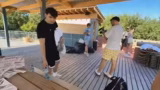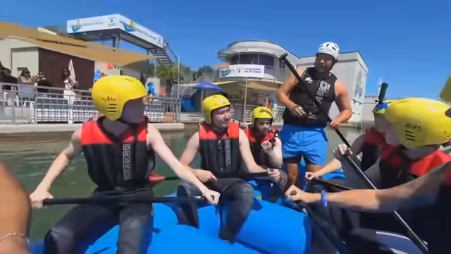 00:08:40Die Gruppe bereitet sich auf die Rafting-Challenge vor. Teilnehmer ziehen Wetsuits an und es herrscht eine lockere, humorvolle Atmosphäre. Es werden Helm und Sonnenbrille getragen. Die Bootszuteilung und die Team-Zusammenstellung werden besprochen. Ein Team besteht hauptsächlich aus englischsprachigen Teilnehmern, während das andere deutschsprachig ist. Anschließend wird eine Gruppendaufoto aufgenommen.