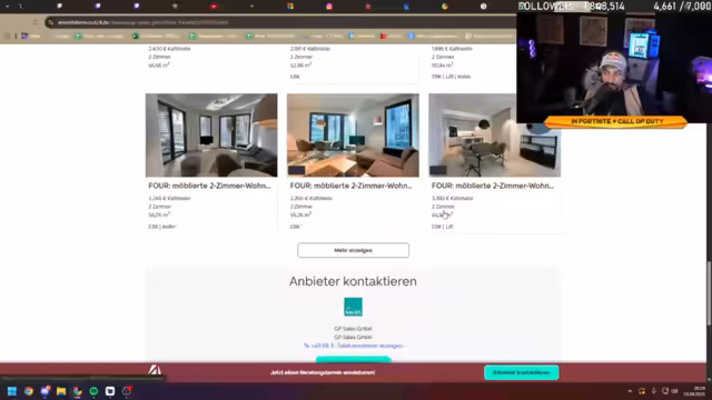 02:04:25Es wird über den Performance Cup Duo gesprochen und welche Teams sich qualifiziert haben. Es wird festgestellt, dass viele der qualifizierten Spieler nicht streamen. Es wird versucht, Vico, Tay und Cheaten-Drexer zu kontaktieren, um sie zum Streamen zu bewegen, damit eine Viewing-Party stattfinden kann. Shark wird ebenfalls kontaktiert, aber es wird bezweifelt, dass er sich erinnern kann. Es wird überlegt, welche Filter bei der Wohnungssuche auf ImmoScout gesetzt werden sollen. Die Pros schreiben, dass sie Fieber haben und es ihnen schlecht geht. Shark entschuldigt sich, dass er nicht streamen kann. Es wird versucht, sich erneut bei ImmoScout anzumelden, was aufgrund von Problemen mit dem Passwort und der Zwei-Faktor-Authentifizierung erschwert wird. Tay wird gelobt, falls er es schafft, den Stream anzuschalten. Es wird überlegt, ob man umziehen soll. Es wird nach Wohnungen in Frankfurt gesucht, wobei die Kaltmiete, Wohnfläche und Zimmeranzahl festgelegt werden.