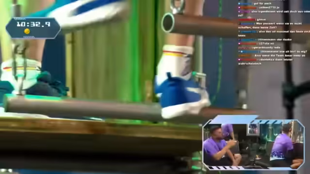 00:09:35Die Teams stehen vor der Herausforderung, Lianen zu überwinden, was enorme Kraftanstrengung erfordert. No Way kämpft, stürzt aber, was bedeutet, dass beide Teammitglieder von vorne beginnen müssen. Die Regeln werden erläutert, und die Anstrengung wird betont. No Way gibt nicht auf und kämpft sich erneut hoch. Die Zuschauer werden aufgefordert, die Teams anzufeuern. Es wird die extreme Belastung der Arme durch das Greifen hervorgehoben. Diskussionen entstehen über die korrekte Ausführung bei den Kokosnüssen. No Way und Leon kämpfen sich durch den Parcours, werden aber von den Zuschauern für ihren Einsatz gefeiert. Ein Team kommt noch, und es bleibt spannend. Die Teams wissen, dass nach der Airstage noch die Wasserwelt wartet, wo sie eventuell Punkte aufholen können. Es wird klargestellt, dass ein erneuter Sturz das Aus für die Airstage bedeutet. Die Teams versuchen, die Stage ordentlich zu beenden.